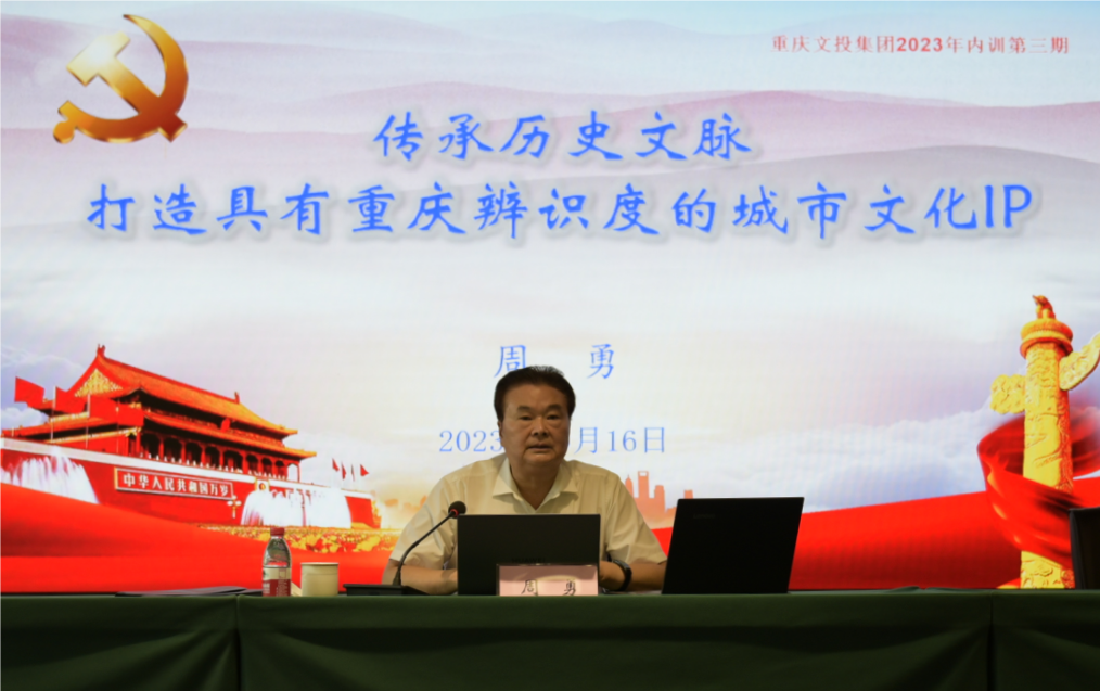 周勇认为,“重庆文化体系”是重庆最大的城市文化IP。在重庆3000多年的发展史上,出现过多层次、多领域、多形态的文化现象,其中居于主体地位的是巴渝文化、革命文化、三峡文化、移民文化、抗战文化、统战文化六种形态。这是居于重庆历史文化体系顶层,最具代表性和符号意义的文化元素,由此构成了独具特色的“2+4结构”的重庆历史文化体系。周勇谈到,要把握好重庆文化的两个基础——巴渝文化、革命文化,要认识到“革命文化”是近代以来贯穿重庆文化始终的主流文化,同时把握好重庆文化的四个阶段性特色文化——三峡文化、移民文化、抗战文化、统战文化。周勇现场分享了纪录片《大后方》《城门几丈高》、电影《苦干》《火凤重天》、民乐音乐会《弦上巴渝》、巫山红叶节、重庆开埠历史陈列馆、九龙坡周贡植故居等以“重庆文化体系”为本底的重庆城市文化IP项目案例。周勇说,胜天国际集团应切实履行好市级国有文化资本投资运营主体职能,对文化产业发展进行战略性投资引导,他对胜天国际集团在新时代新征程新重庆的新形势下的投资方向提出了建议意见。