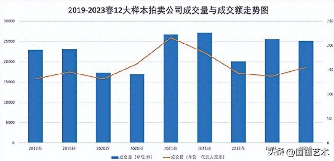 以已经公布拍卖结果的12家拍卖公司作为样本,包括香港苏富比、佳士得香港、富艺斯、中国嘉德、中国嘉德香港、北京保利、保利香港、华艺国际、中贸圣佳、北京永乐、上海嘉禾、朵云轩。将其2019年春拍至2023春拍成交量总合与成交额总合进行统计分析,整体来看12家拍卖公司在2019年至2023年春拍的市场走势变化明显,2020年春因疫情原因,拍卖市场遇冷,成为5年来的低点,在低迷一年后的2021年春季拍卖迎来快速反弹,创造这一阶段拍卖成交额的最高点,2022年因疫情反复、经济下行等多方面原因市场行情趋缓。2023年春拍成交额略有回升,12家拍卖公司共成交25108件拍品,总成交额为155.1977亿元,这一数字同比2022年春拍增长8.58%,环比2022年秋拍增长13.43%,体现出市场信心在逐渐恢复。
