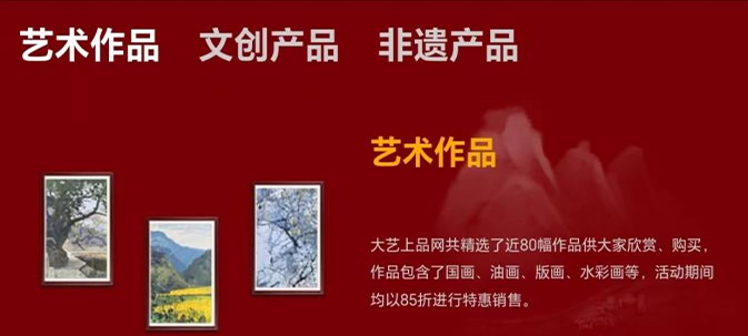 春节大假,是出门游玩、走亲访友的最佳时机,“重庆艺术大市场·艺术年货节”为了让众多有出行计划的市民也能参与到“艺术年货节”中来,特别在“大艺上品”网上商城开通了“线上艺术嗨购”活动,让不能亲赴线下艺术现场的市民、游客进行线上观展,零距离感受艺术的魅力。